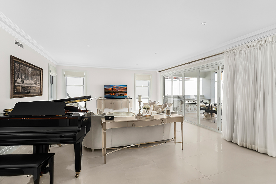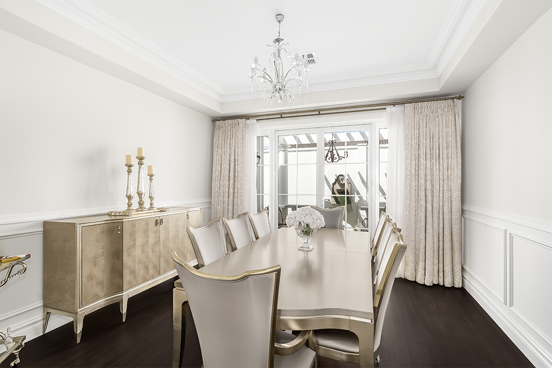 The living area flows out onto the alfresco through bifold doors, creating a seamless transition between indoor and outdoor for increased entertaining potential. Chandeliers adorn both dining areas and the foyer for a sophisticated touch, whilst provincial furnishings present a calm, classic look that is warm and inviting despite the home’s cooler tones.
