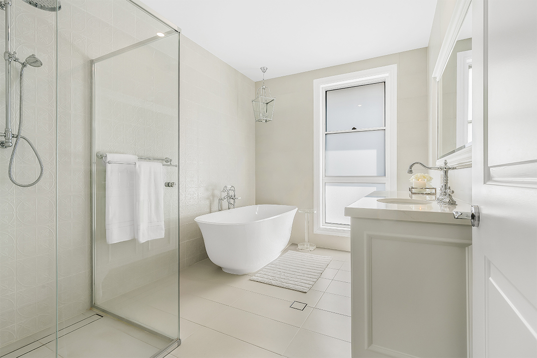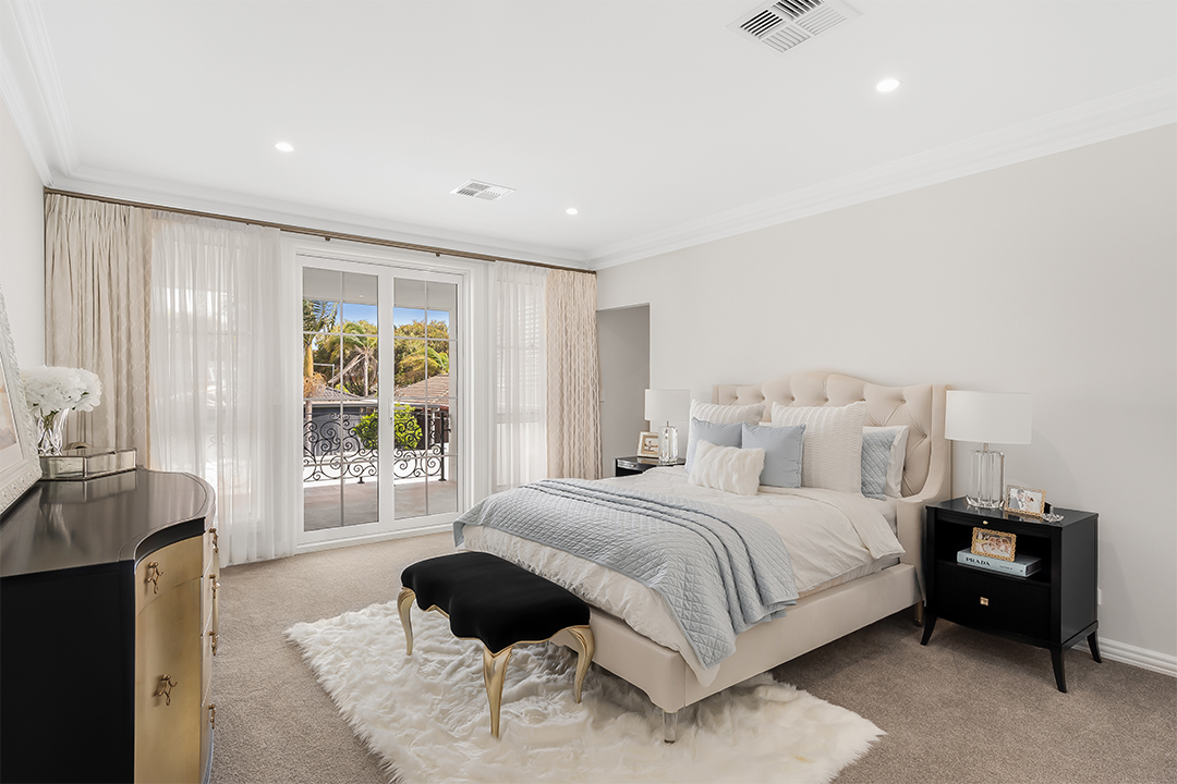The main bedroom maintains the French inspiration with soft grey carpet and off-white Dulux paint. Black accents give a welcome contrast, complementing the wrought iron that fences the private balcony. The en suite showcases marbled grey tiles that form the splashback, silver taps, handles and mirror frames, and shaker-style cabinetry, all matching the family bathroom.