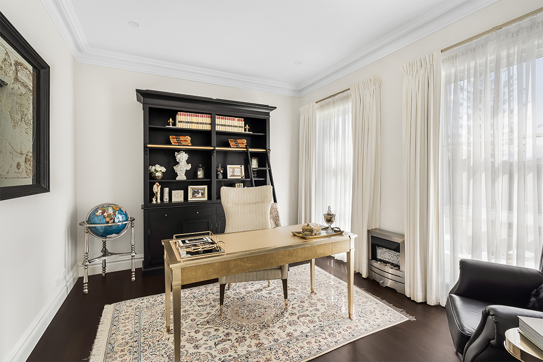 Dark wooden flooring on the landing and in the compact study gives the home a monochromatic charm. The staircase railing proudly displays the same wrought iron fencing as the balcony, blending the exterior and interior together in one unified statement.